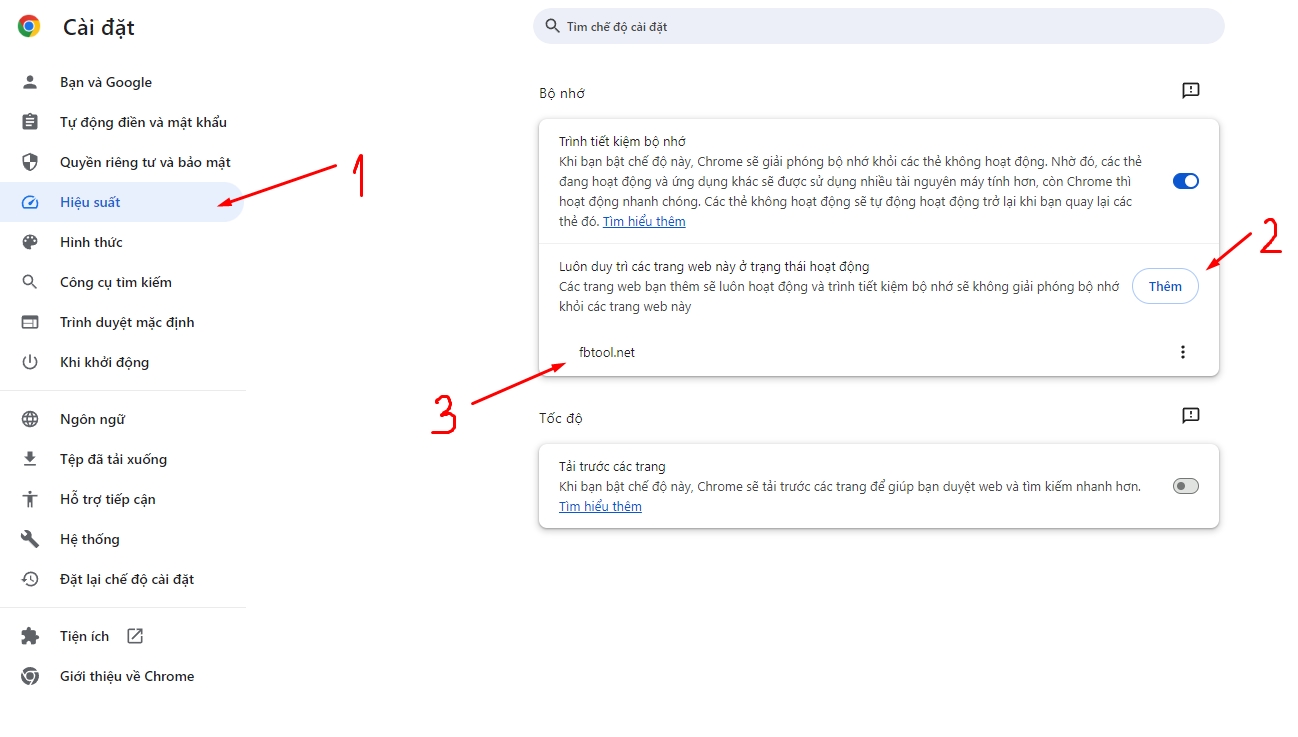 Chọn dấu 3 chấm góc trên bên phải của trình duyệt -> Cài đặt -> Hiệu suất -> thêm toptoptool.net